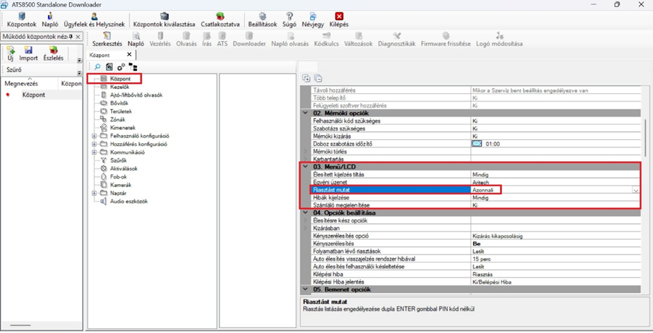- Központ / 03. Menü / LCD / Riasztást mutat = Azonnali