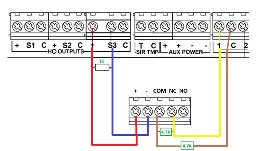 A támadásjelző COM / NC kimenete csatlakozik a központ zónáira. Ez akkor is működik, ha a támadásjelző nem kap tápellátást.