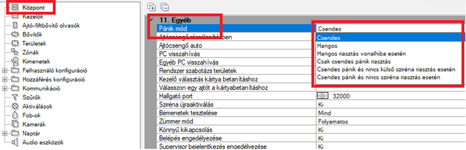 A központ beállításokban globálisan lehet állítani, hogy a rendszerben történt pánik / támadásjelzés milyen reakciót váltson ki: