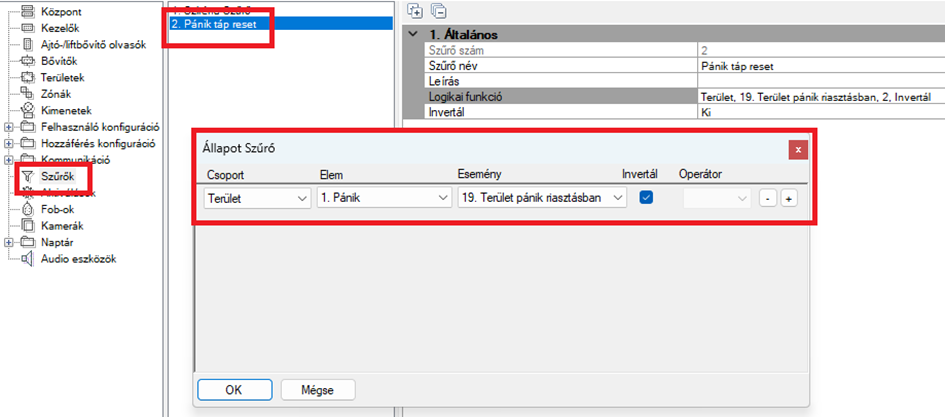 Az Invertál = BE opció miatt az adott kimenet folyamatosan aktív, folyamatosan biztosítja a tápellátást. Viszont amikor a ’Pánik táp reset’ szűrő aktiválásra kerül (ha a pánik zónához tartozó terület már nincs pánik riasztásban), a kimenet működése 3 másodpercre kikapcsol, resetelve ezzel a támadásjelző működését, visszaállítva az aktív LED-et normál állapotba.