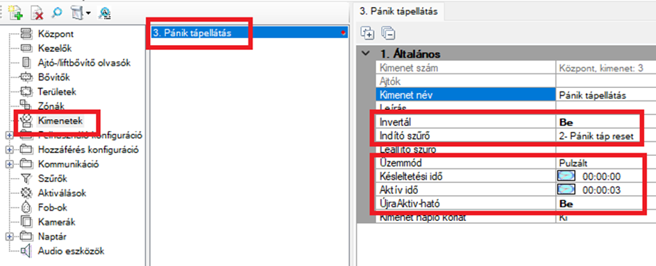 Következő lépésben pedig be kell állítanunk a pánik / támadásjelző eszköz tápellátását biztosító kimenet (jelen esetben központ kimenet 3) működését: